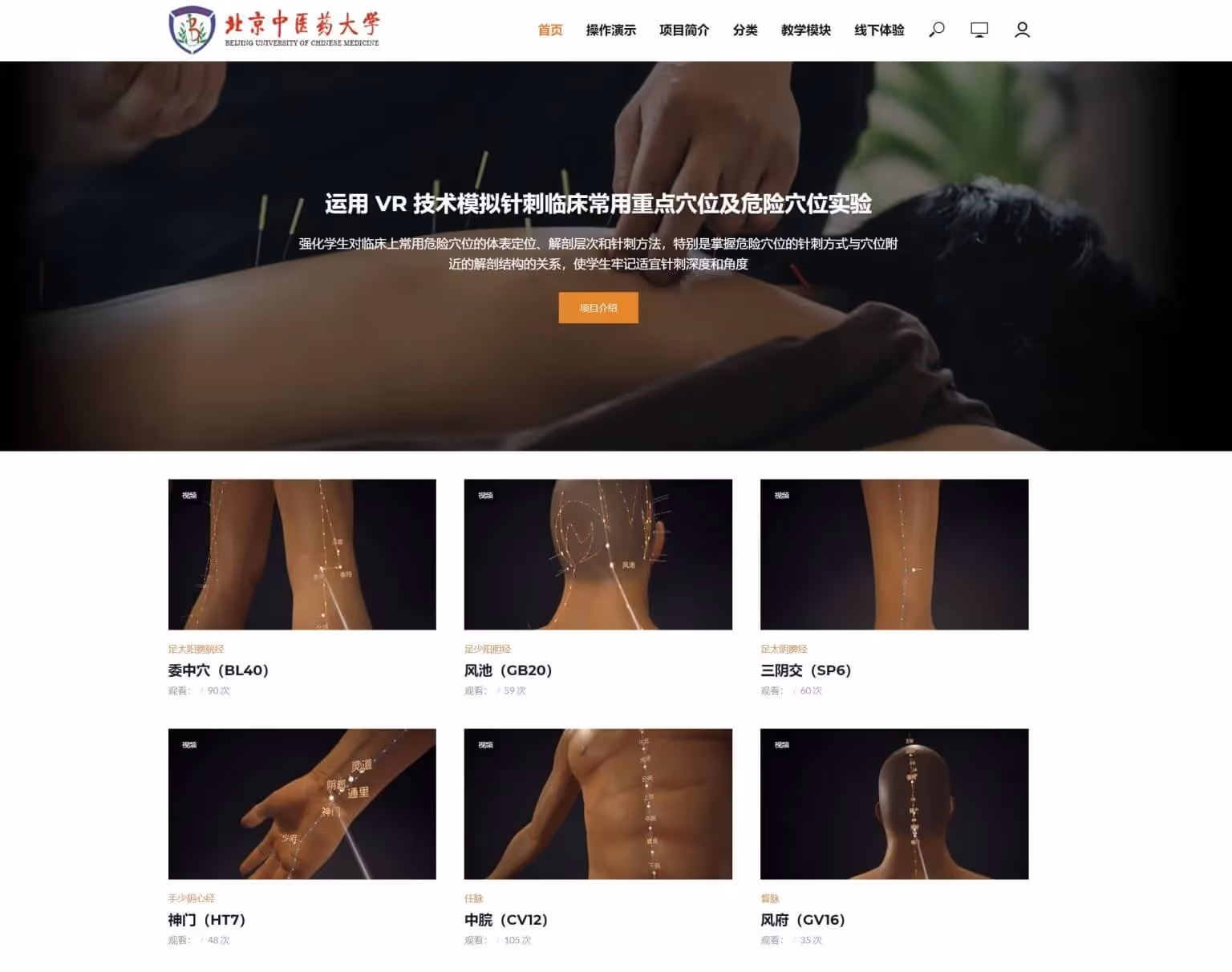 Students using the e-learning portal (pictured above) simply navigate to the video they wish to view and watch as instructors demonstrate how to identify and simulate needle insertion into high risk and dangerous acupoints. The 24 videos in BUCM’s e-learning portal are also featured as an e-learning course on the national experimental e-learning platform which can be accessed by universities across China.