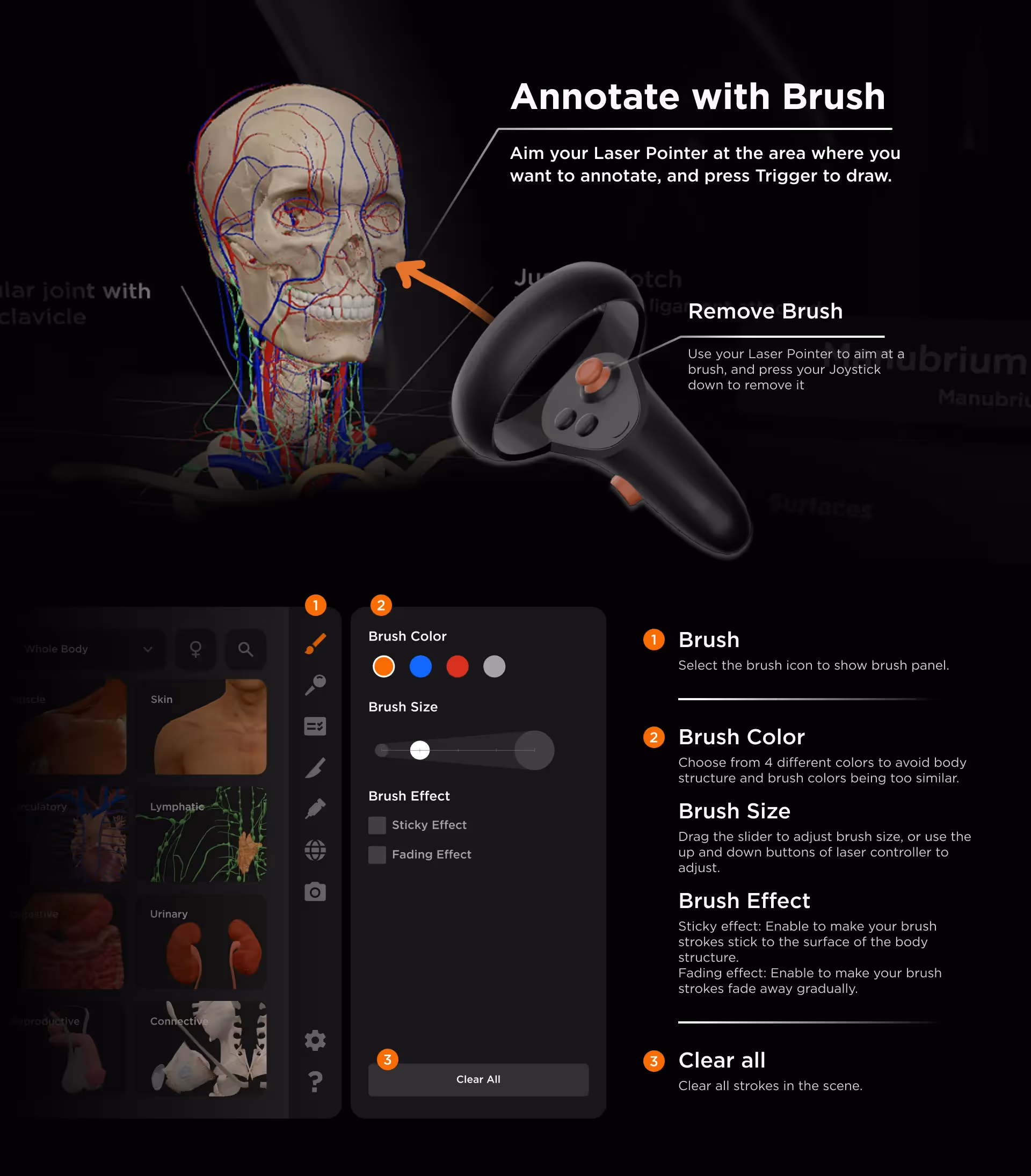 The Controller is a step-by-step guide to help you manipulate the 3D model, including select, grab, move, rotate, scale and hide body structures.